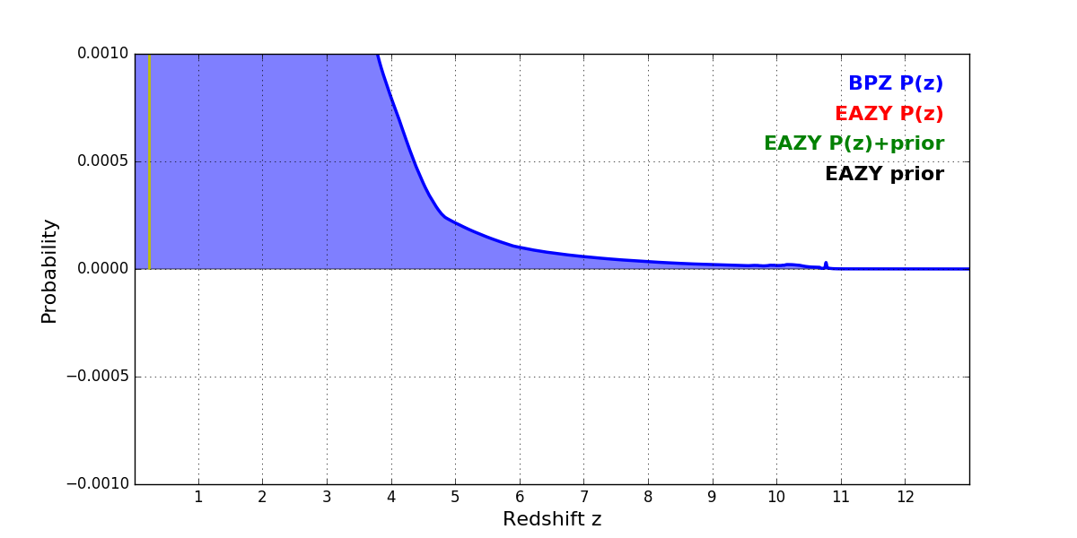 In P(z) plots: Yellow lines mark the cluster redshift z = 0.228,