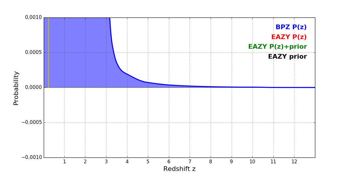 In P(z) plots: Yellow lines mark the cluster redshift z = 0.228,