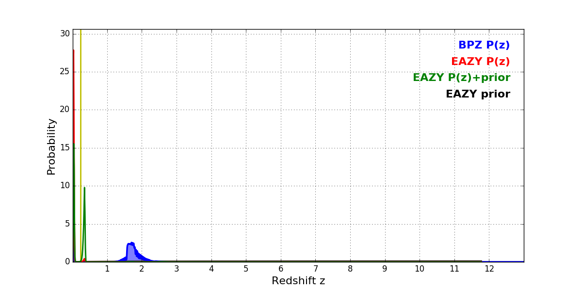 In P(z) plots: Yellow lines mark the cluster redshift z = 0.228,