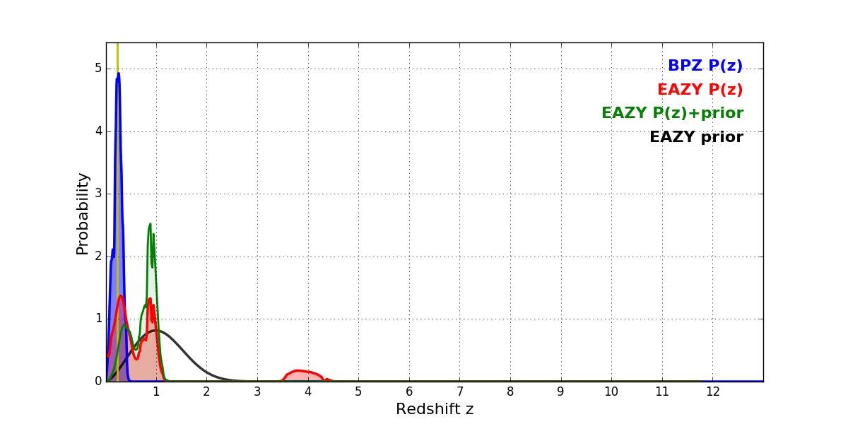 In P(z) plots: Yellow lines mark the cluster redshift z = 0.228,