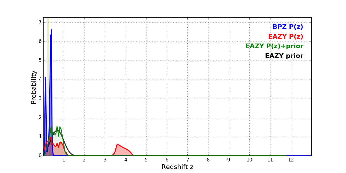 In P(z) plots: Yellow lines mark the cluster redshift z = 0.228,