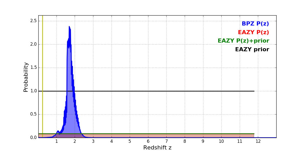 In P(z) plots: Yellow lines mark the cluster redshift z = 0.228,