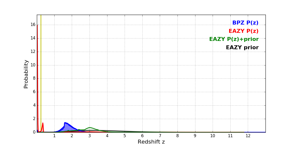 In P(z) plots: Yellow lines mark the cluster redshift z = 0.228,