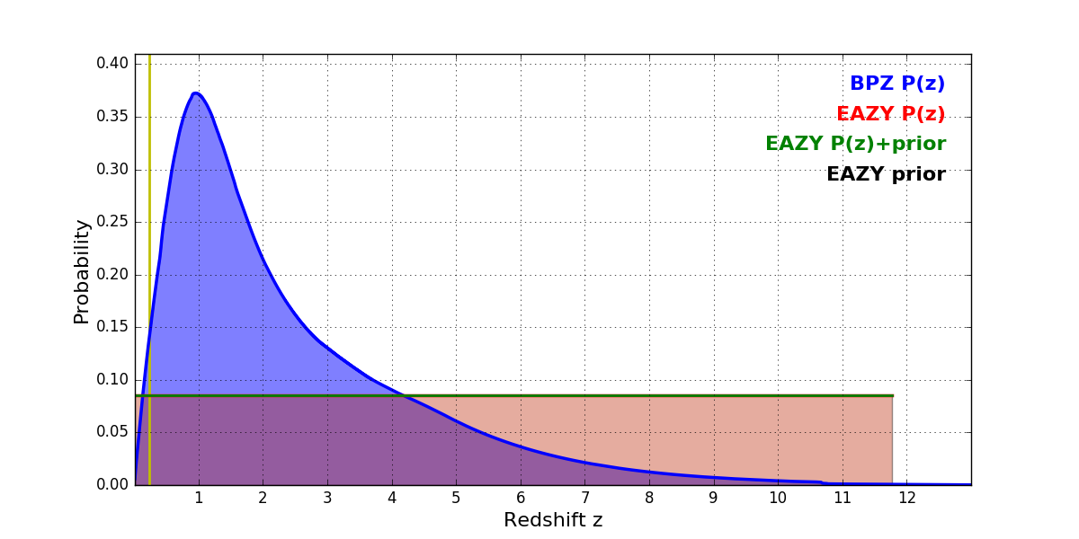 In P(z) plots: Yellow lines mark the cluster redshift z = 0.228,