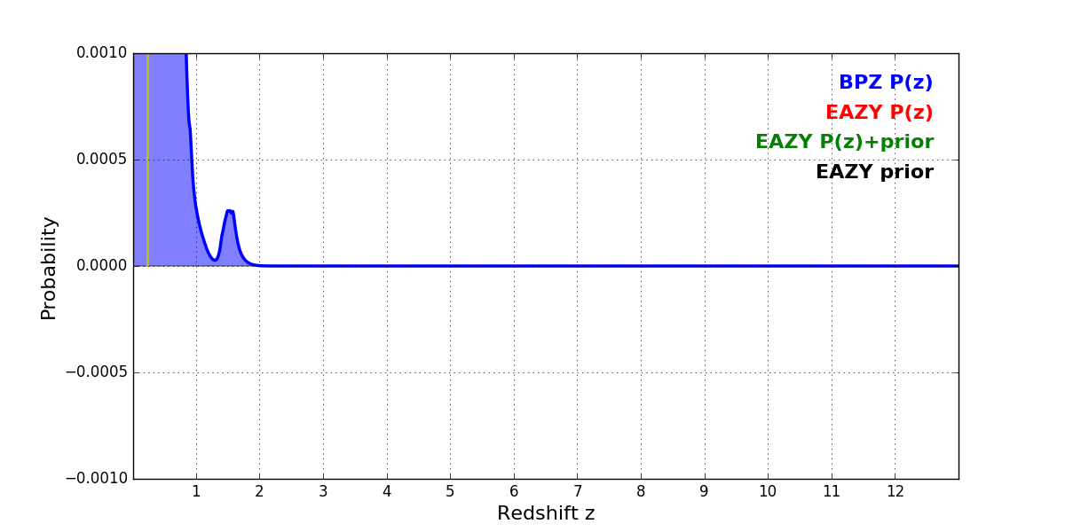 In P(z) plots: Yellow lines mark the cluster redshift z = 0.228,