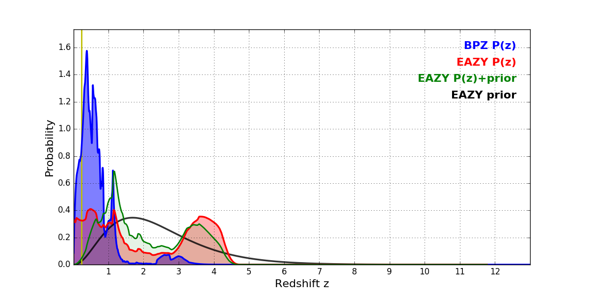 In P(z) plots: Yellow lines mark the cluster redshift z = 0.228,