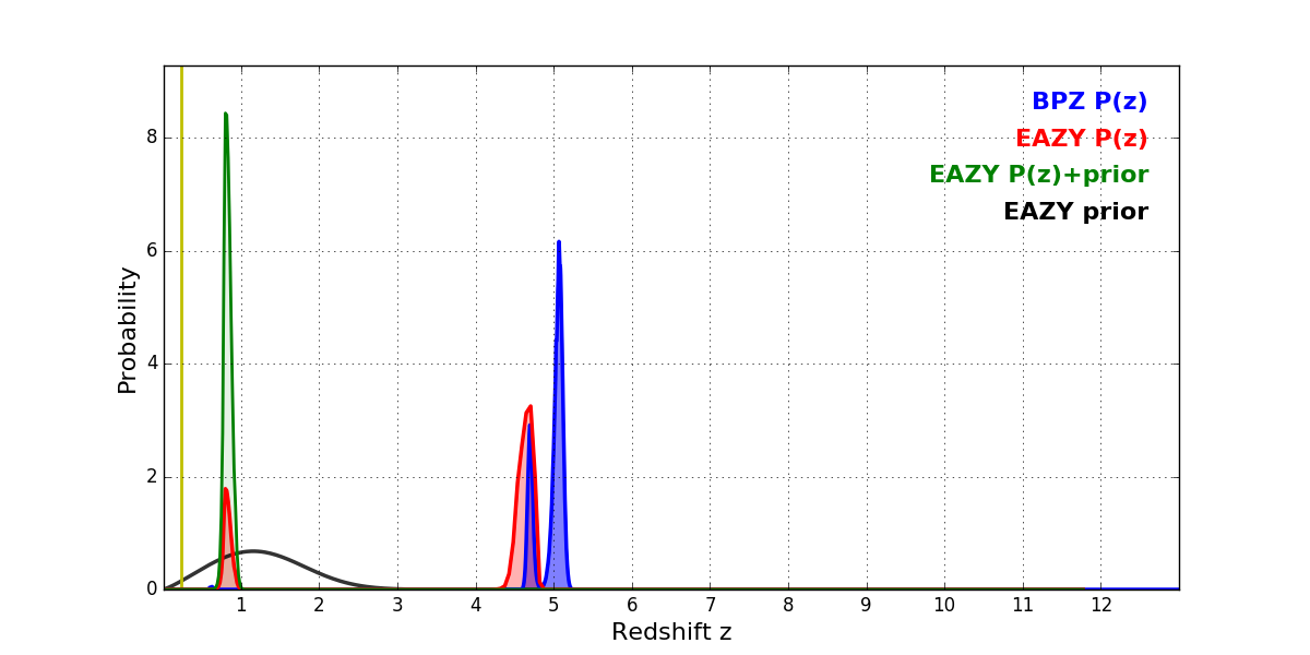 In P(z) plots: Yellow lines mark the cluster redshift z = 0.228,