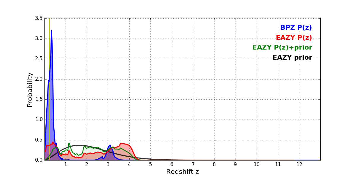 In P(z) plots: Yellow lines mark the cluster redshift z = 0.228,