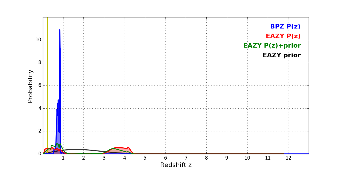 In P(z) plots: Yellow lines mark the cluster redshift z = 0.228,