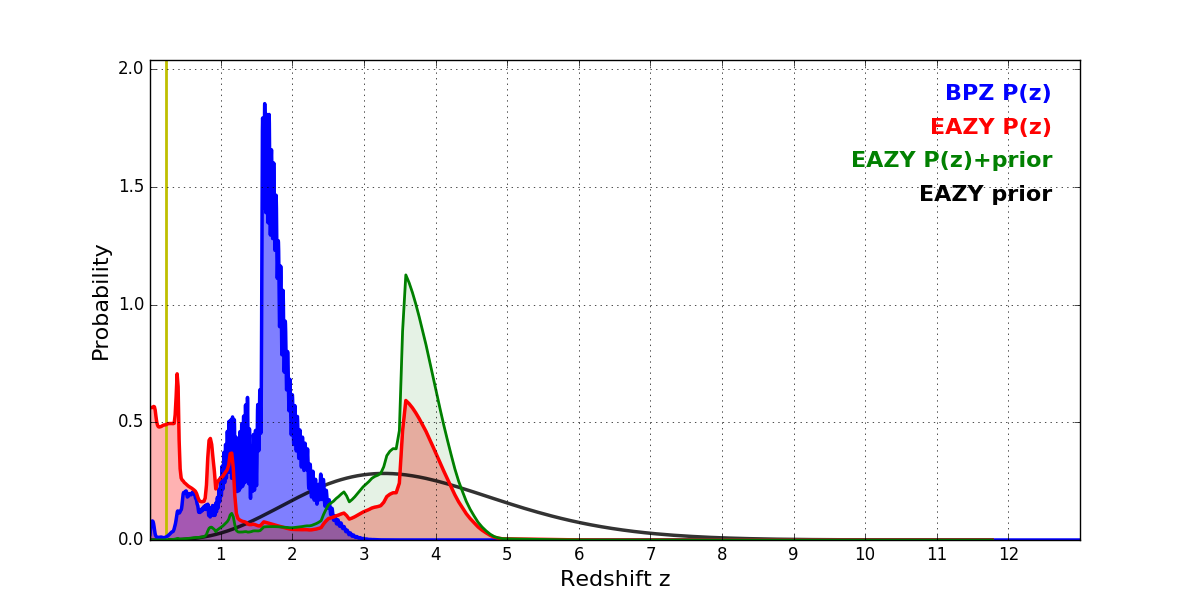 In P(z) plots: Yellow lines mark the cluster redshift z = 0.228,