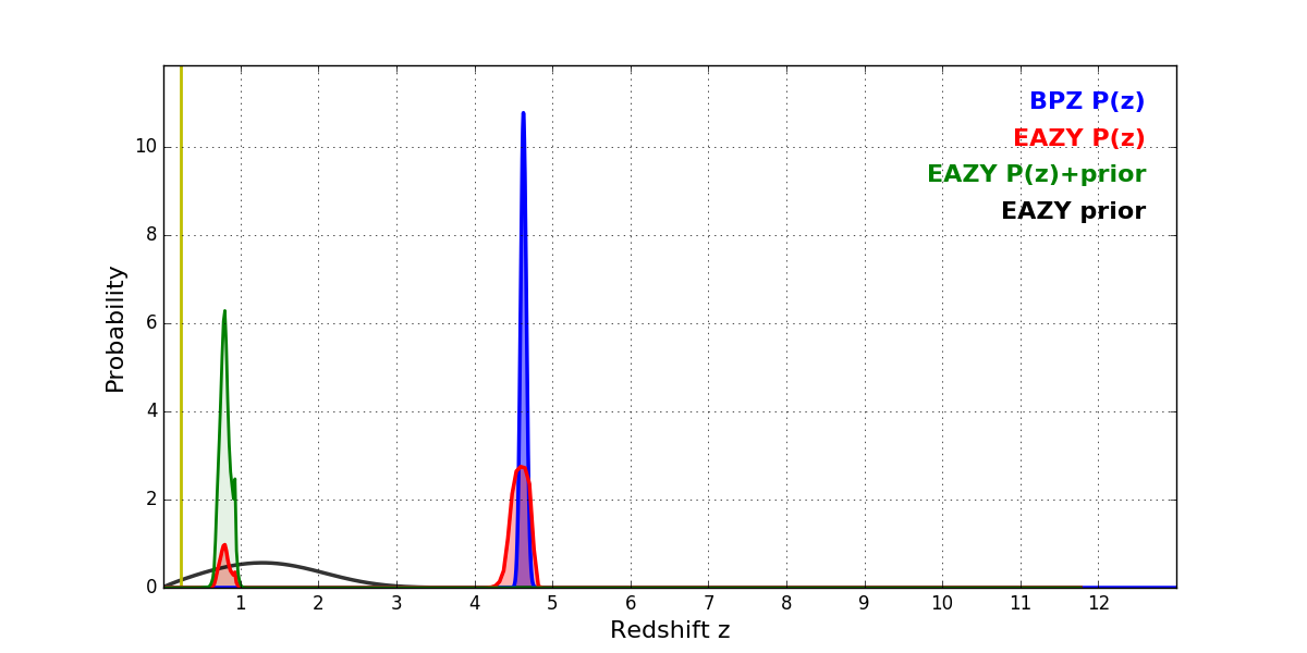 In P(z) plots: Yellow lines mark the cluster redshift z = 0.228,