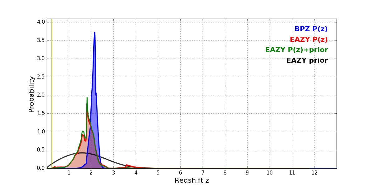 In P(z) plots: Yellow lines mark the cluster redshift z = 0.228,