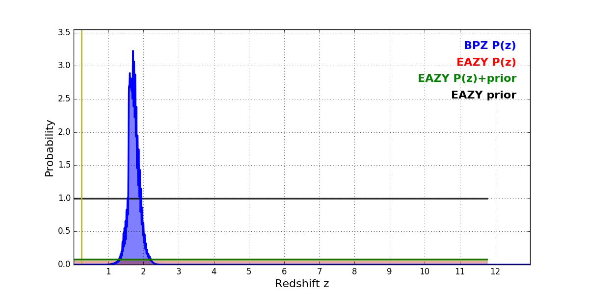 In P(z) plots: Yellow lines mark the cluster redshift z = 0.228,