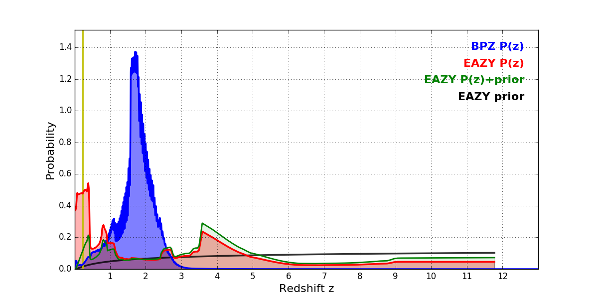 In P(z) plots: Yellow lines mark the cluster redshift z = 0.228,
