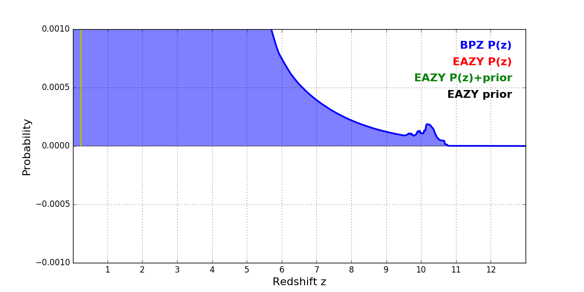 In P(z) plots: Yellow lines mark the cluster redshift z = 0.228,