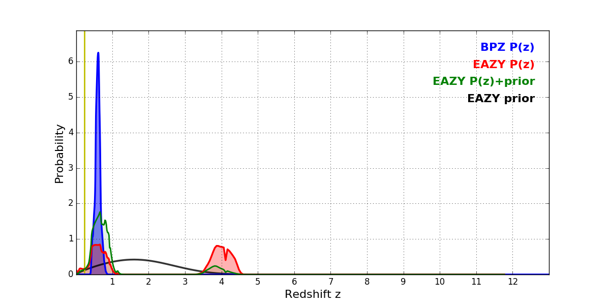 In P(z) plots: Yellow lines mark the cluster redshift z = 0.228,