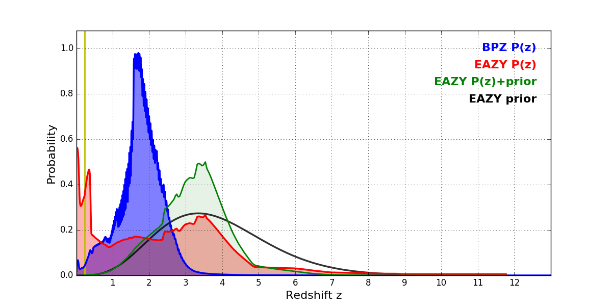 In P(z) plots: Yellow lines mark the cluster redshift z = 0.228,