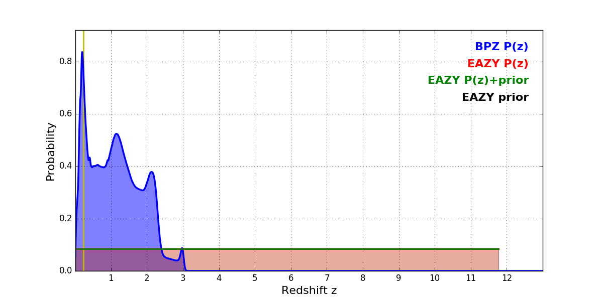 In P(z) plots: Yellow lines mark the cluster redshift z = 0.228,