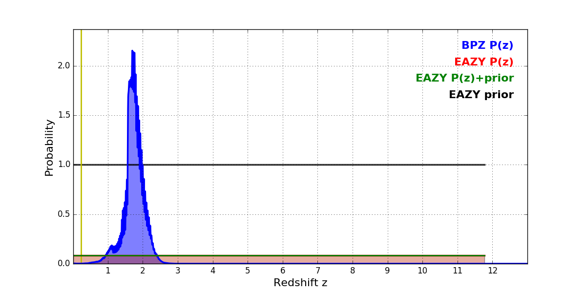 In P(z) plots: Yellow lines mark the cluster redshift z = 0.228,