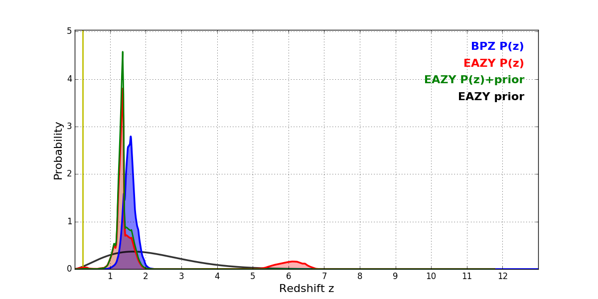In P(z) plots: Yellow lines mark the cluster redshift z = 0.228,