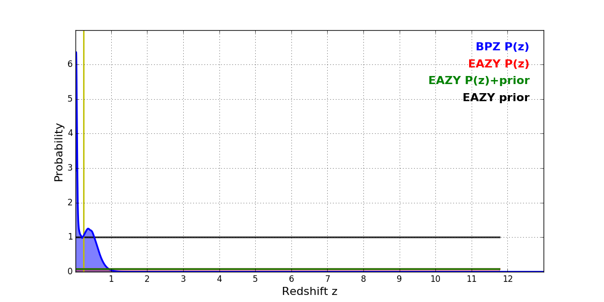 In P(z) plots: Yellow lines mark the cluster redshift z = 0.228,