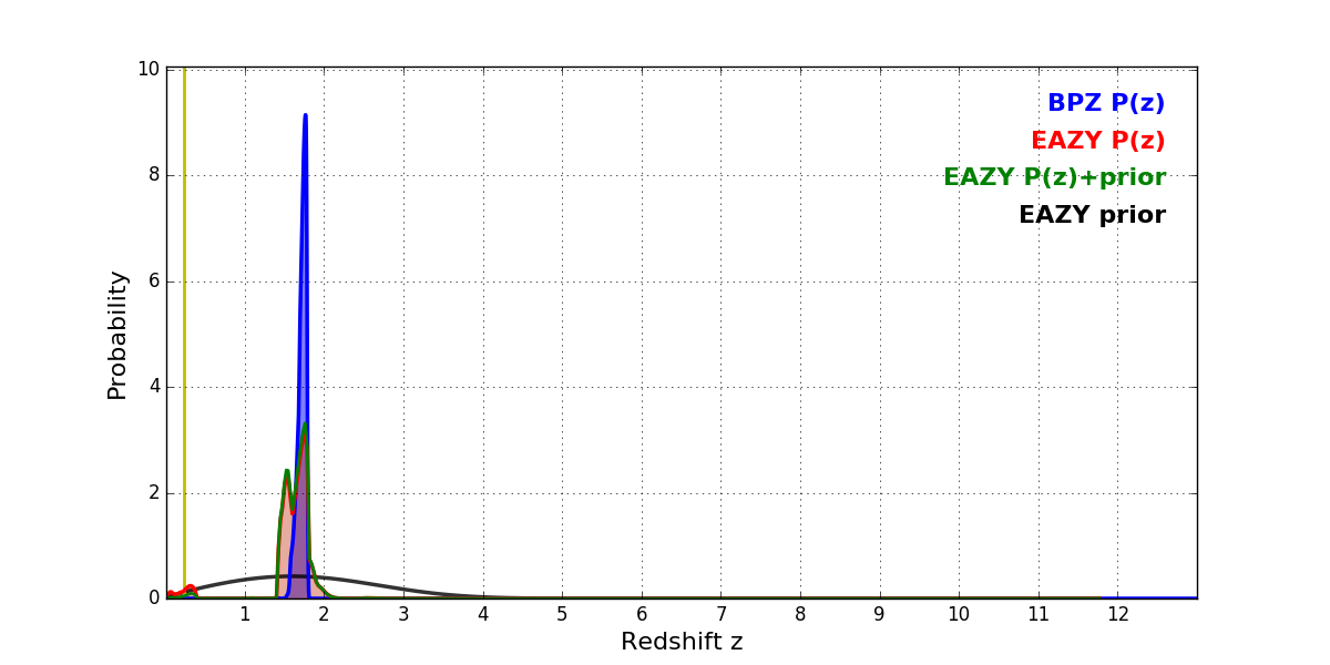 In P(z) plots: Yellow lines mark the cluster redshift z = 0.228,