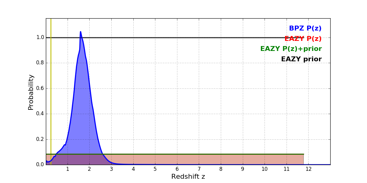In P(z) plots: Yellow lines mark the cluster redshift z = 0.228,