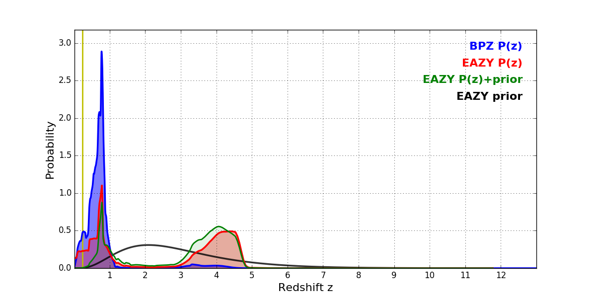In P(z) plots: Yellow lines mark the cluster redshift z = 0.228,