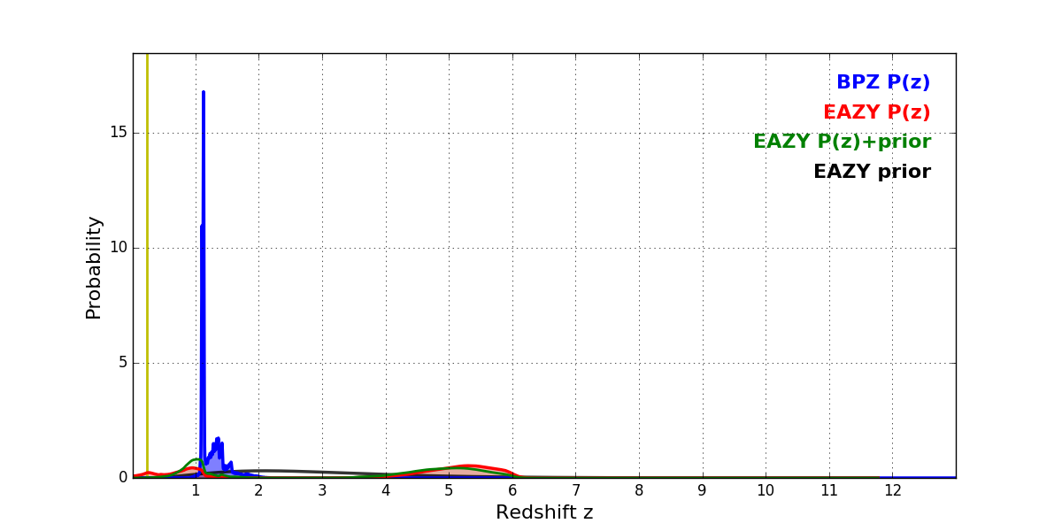 In P(z) plots: Yellow lines mark the cluster redshift z = 0.228,