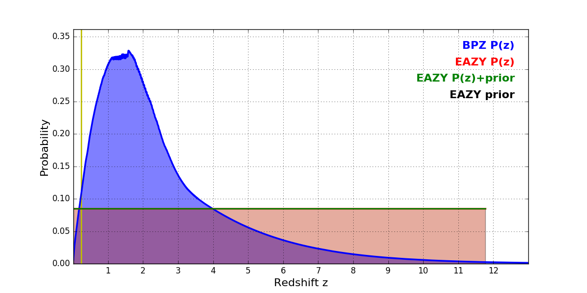 In P(z) plots: Yellow lines mark the cluster redshift z = 0.228,