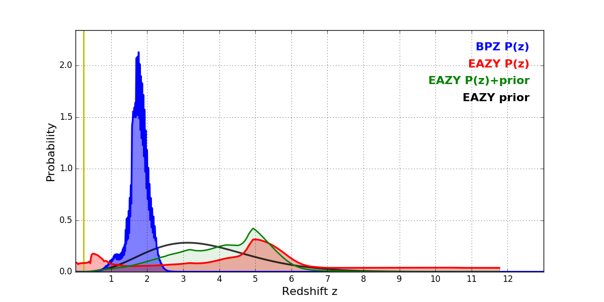 In P(z) plots: Yellow lines mark the cluster redshift z = 0.228,