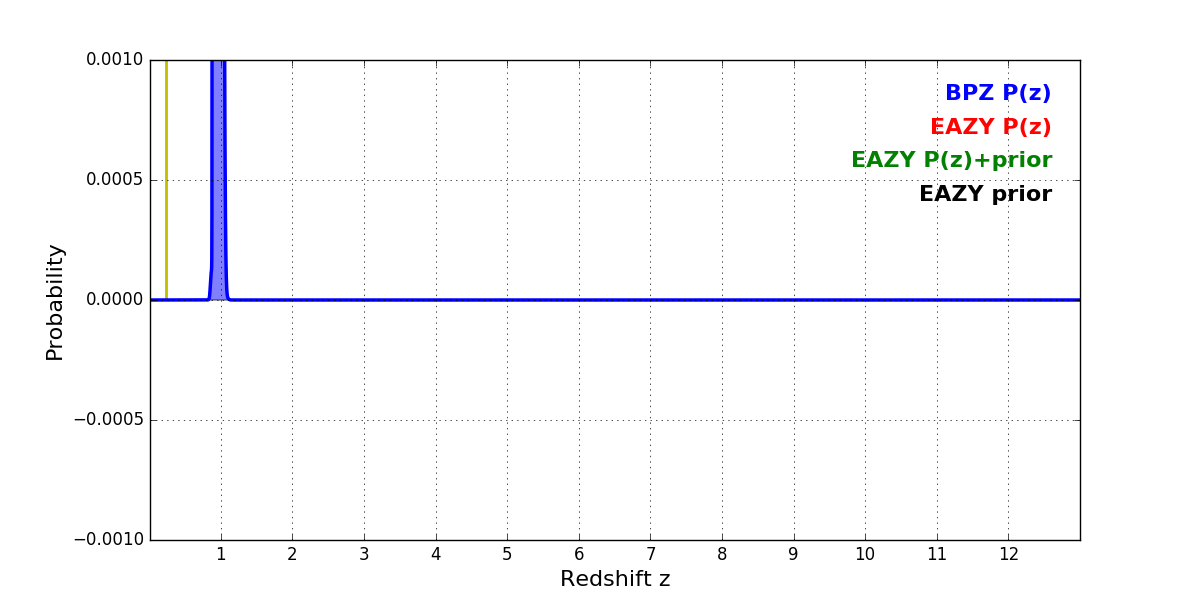 In P(z) plots: Yellow lines mark the cluster redshift z = 0.228,