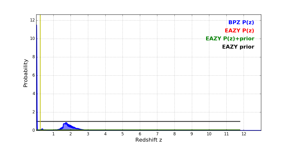 In P(z) plots: Yellow lines mark the cluster redshift z = 0.228,