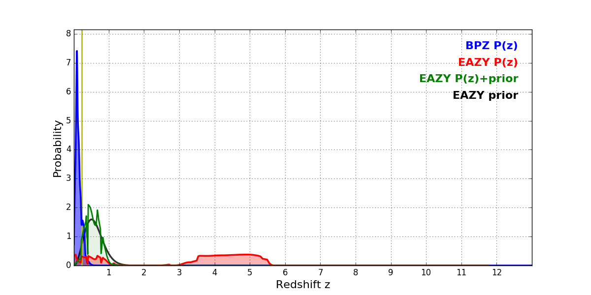 In P(z) plots: Yellow lines mark the cluster redshift z = 0.228,