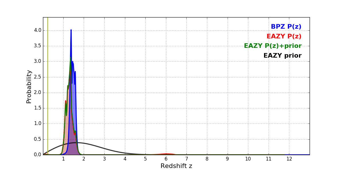 In P(z) plots: Yellow lines mark the cluster redshift z = 0.228,