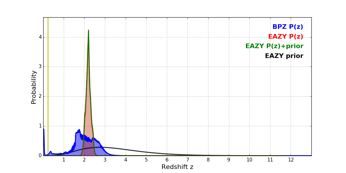 In P(z) plots: Yellow lines mark the cluster redshift z = 0.228,
