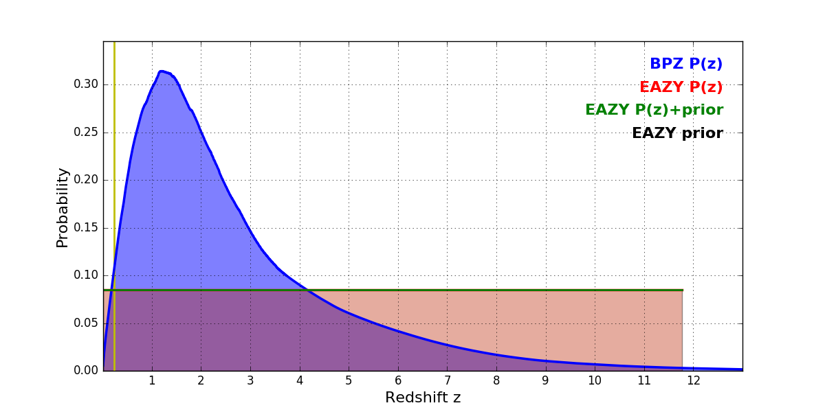 In P(z) plots: Yellow lines mark the cluster redshift z = 0.228,