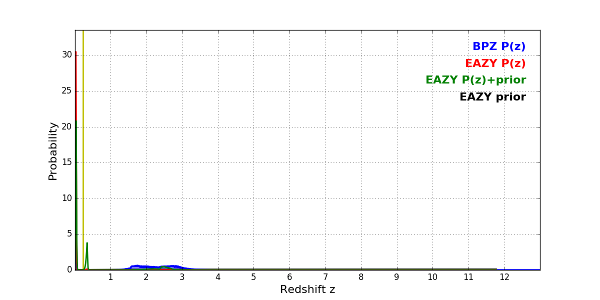 In P(z) plots: Yellow lines mark the cluster redshift z = 0.228,