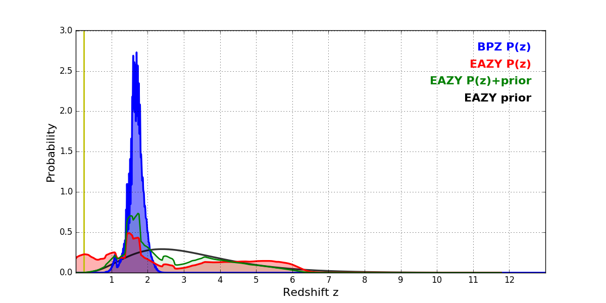 In P(z) plots: Yellow lines mark the cluster redshift z = 0.228,