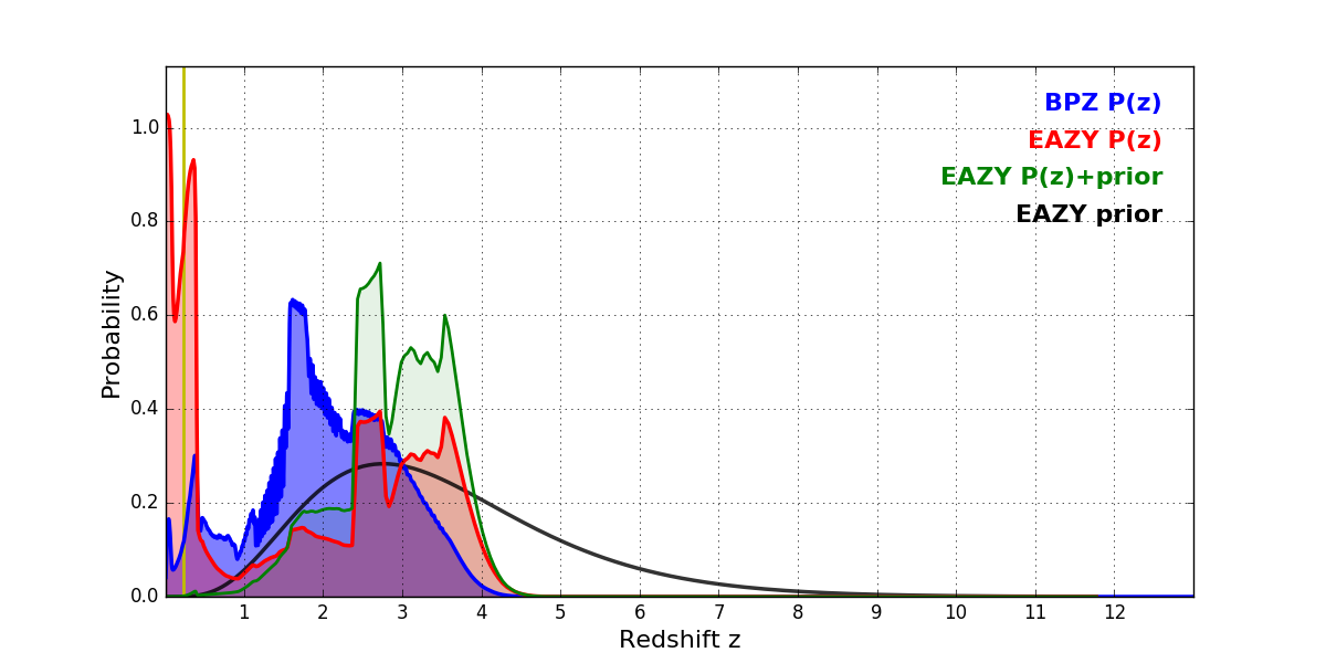 In P(z) plots: Yellow lines mark the cluster redshift z = 0.228,