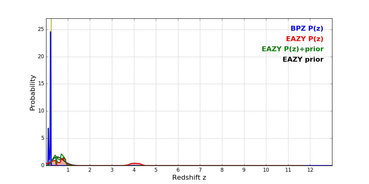 In P(z) plots: Yellow lines mark the cluster redshift z = 0.228,
