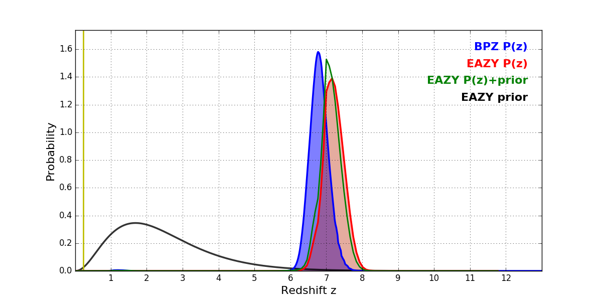 In P(z) plots: Yellow lines mark the cluster redshift z = 0.228,