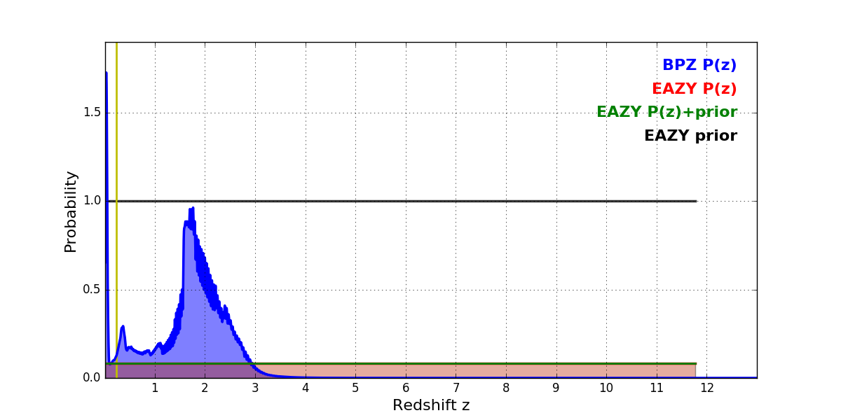 In P(z) plots: Yellow lines mark the cluster redshift z = 0.228,