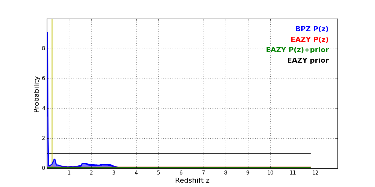 In P(z) plots: Yellow lines mark the cluster redshift z = 0.228,