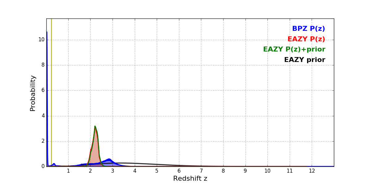 In P(z) plots: Yellow lines mark the cluster redshift z = 0.228,