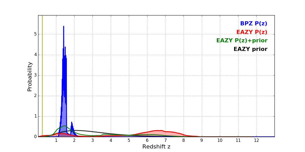 In P(z) plots: Yellow lines mark the cluster redshift z = 0.228,