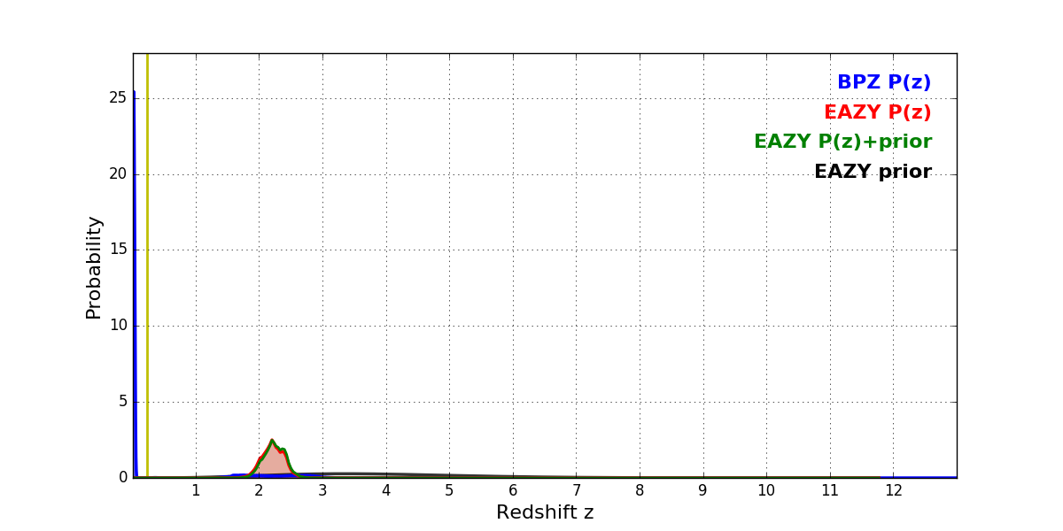 In P(z) plots: Yellow lines mark the cluster redshift z = 0.228,