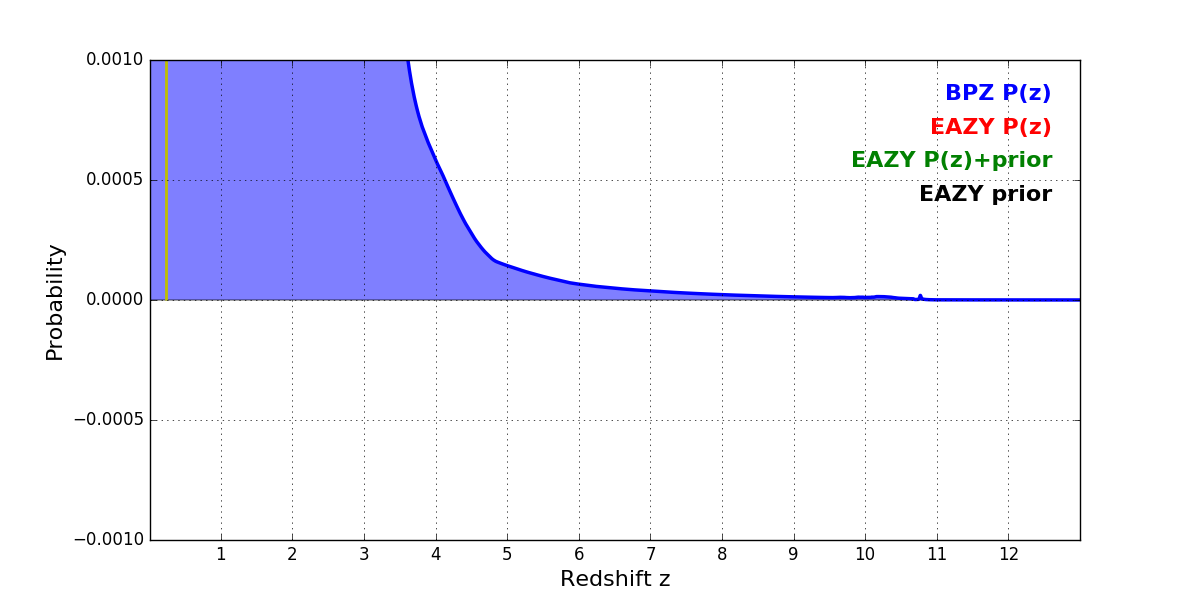 In P(z) plots: Yellow lines mark the cluster redshift z = 0.228,