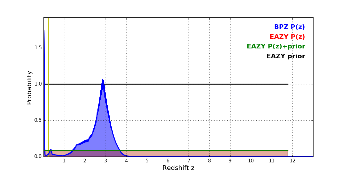 In P(z) plots: Yellow lines mark the cluster redshift z = 0.228,