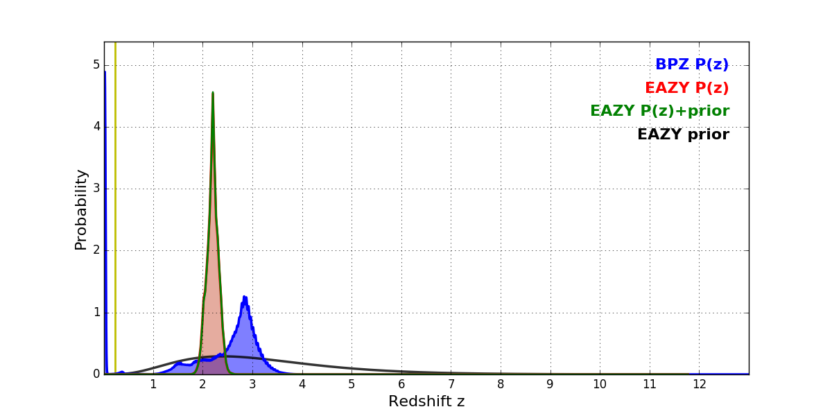 In P(z) plots: Yellow lines mark the cluster redshift z = 0.228,
